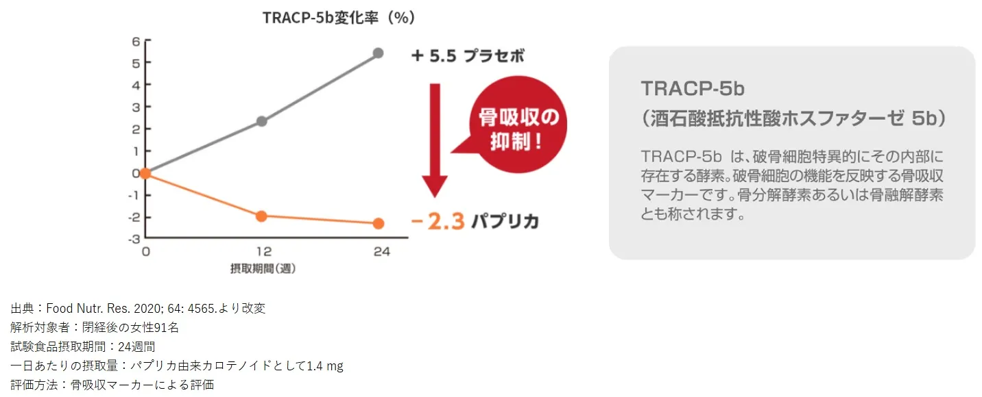 現在、パプリカロテンは「骨の健康」を主軸に展開されています。なかでも特に注目されているのが、骨吸収マーカー「TRACP-5b」の上昇を抑制するエビデンスです。