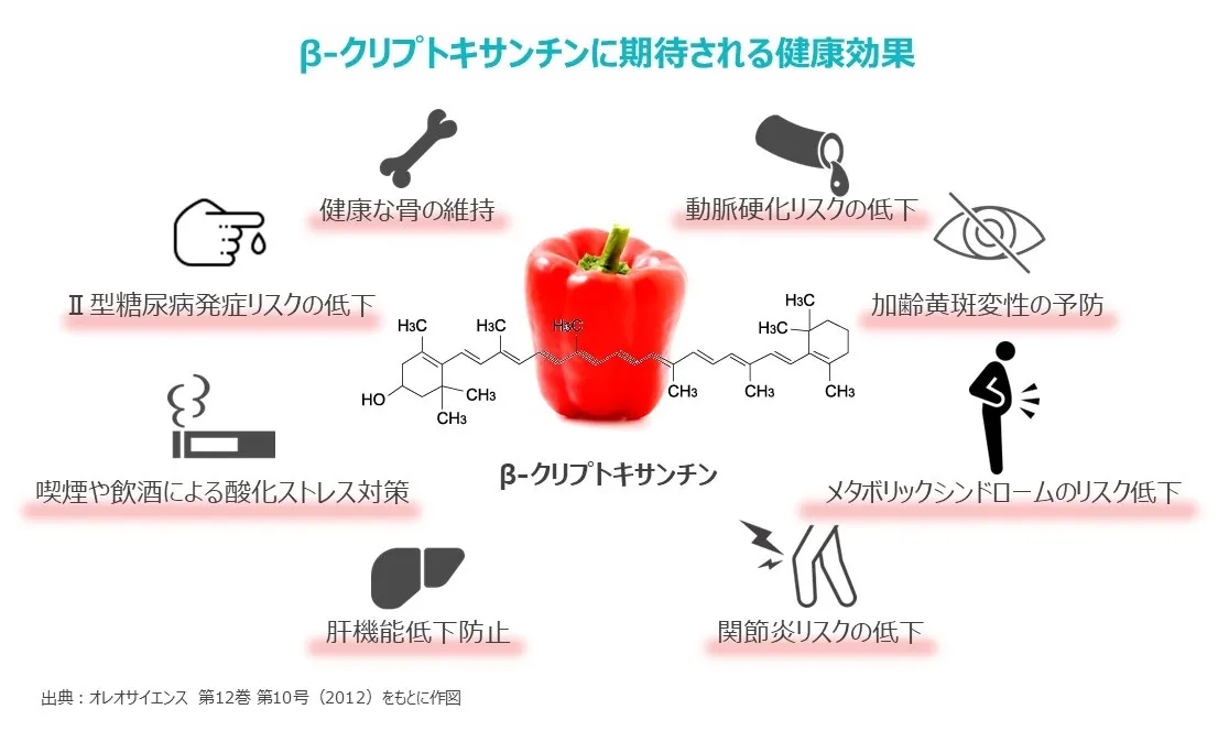 パプリカロテンを継続摂取すると、クリプトキサンチンの血中濃度が安定して上昇することはわかっているので、クリプトキサンチンの疫学調査等で示されている様々な機能性をパプリカロテンも持つはずです。